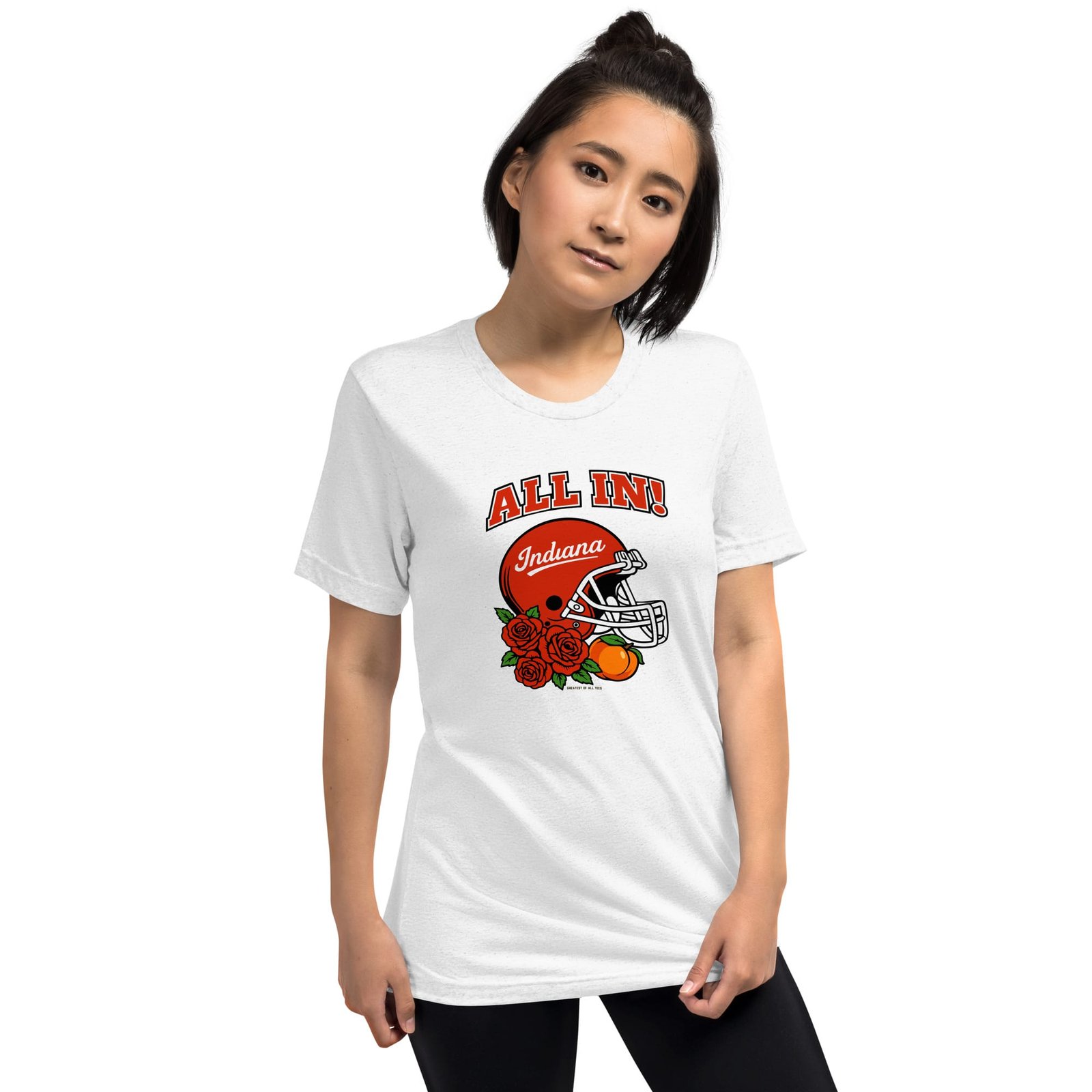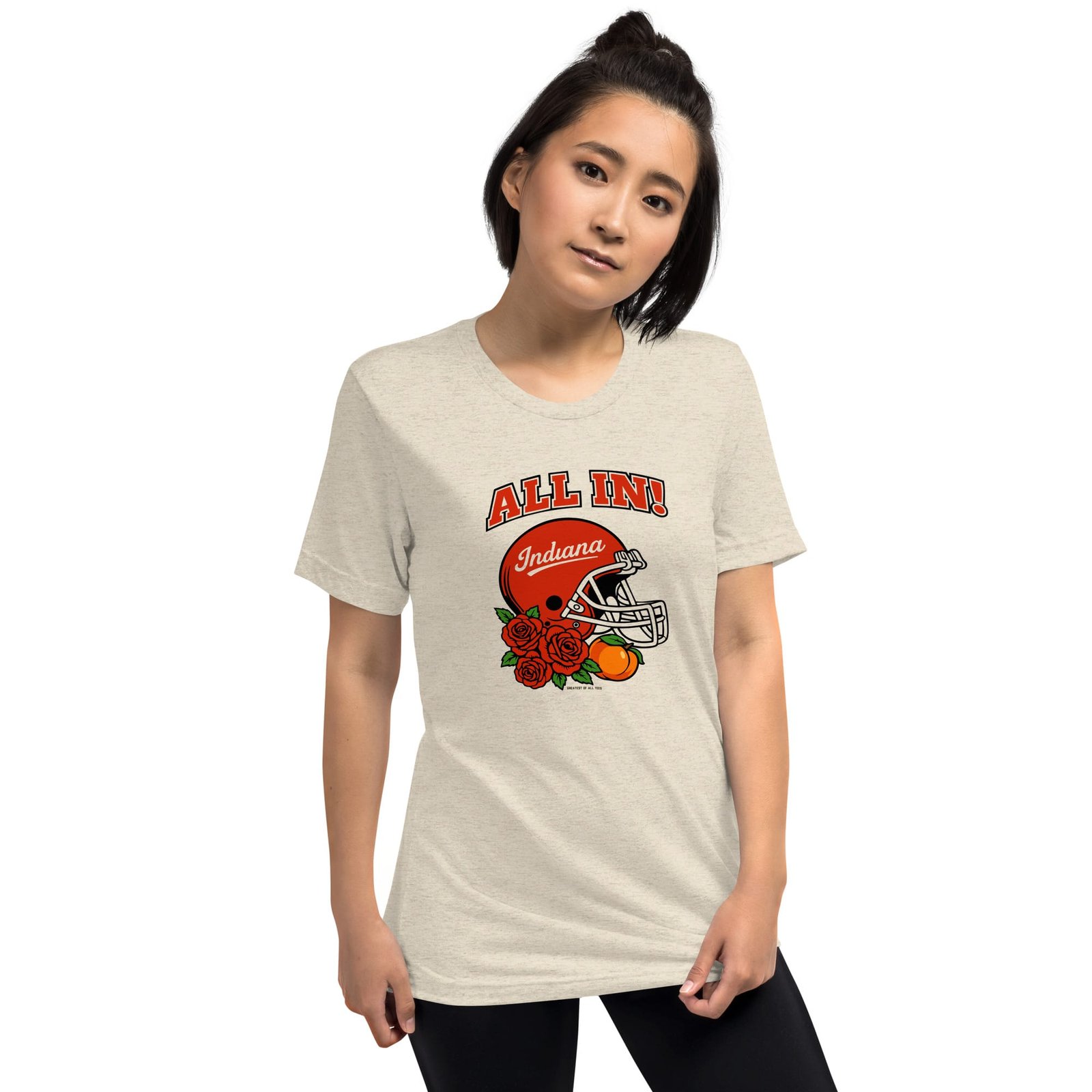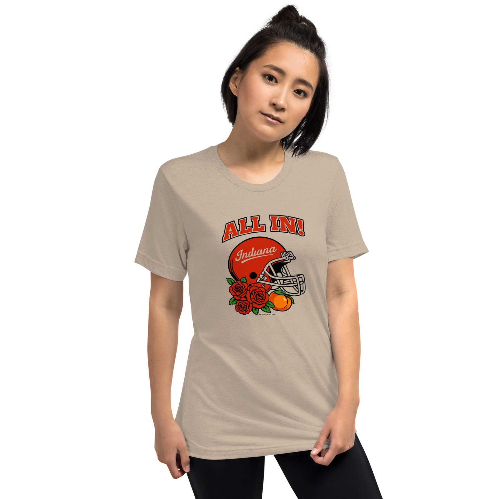 Show that you’re going all in with the All In Indiana Football Helmet Rose and Peach Tee. Made for super fans to show that they’re committed to cheering on their favorite Bloomington football team. The tri-blend fabric creates a vintage, fitted look. And extreme durability makes this t-shirt withstand repeated washings and still remain super comfortable.